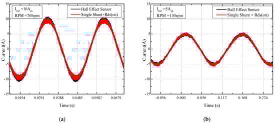 (a) 700 rpm@10 Apk Hall-effect sensor vs. single shunt + Rds(on) control current waveform; (b) 130 rpm@5 Apk Hall-effect sensor vs. single shunt + Rds(on) control current waveform.