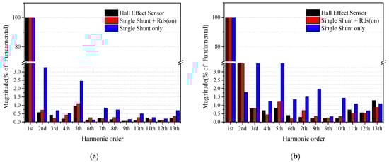 (a) Hall-effect sensor vs. single shunt + Rds(on) vs. single shunt only FFT for current waveform during current control at 700 rpm@10 Apk; (b) Hall-effect sensor vs. single shunt + Rds(on) vs. single shunt only FFT for current waveform during current control at 130 rpm@5 Apk.