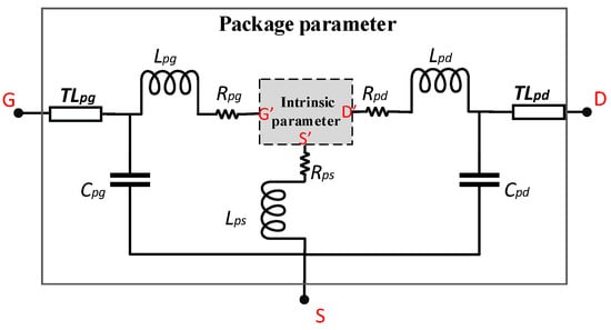Note that CGH40010F is a packaged transistor, and the parasitic effect caused by the package has a great influence on its high-frequency performances that cannot be ignored. Therefore, parasitic capacitance and inductance should be extracted. The architecture of the package parameters is shown in Figure 2, and the dashed box represents the intrinsic parameters of the EEHEMT model. The optimization target was set to make the S-parameters difference between two circuits with different device models as small as possible.