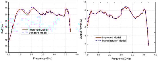 To verify the correctness of the extracted parameters, an identical wideband PA circuit with the improved model and the model provided by the manufacturer were simulated separately. When the simulation results of the two circuits are in good agreement, it can be demonstrated that the improved model and the manufacturer’s model have the same performance at the positive drain voltage. In other words, the extracted parameters can be demonstrated correctly. Figure 3 shows a comparison of the results for power added efficiency (PAE) and output power. It can be found that the simulation results of PAE and output power are in good agreement between the improved model and the manufacturer’s model, respectively. Therefore, the correctness of the extracted parameters was verified.