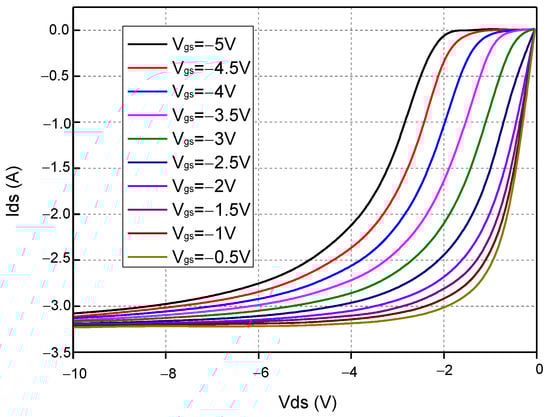 The parameter extraction of the reverse drain-source bias model is similar to the previous parameter extraction process; the only difference is the current formula. The current equations in [14] are also adopted to model the reverse bias states and, based on the Callet model and measured data of negative drain voltages, with the similar parameter extraction method, the fitted parameters are given in Table 4, and the DC I–V waveform under negative drain bias is shown in Figure 4. It can be seen that DC characteristics in the third quadrant region are similar to characteristics of a diode.