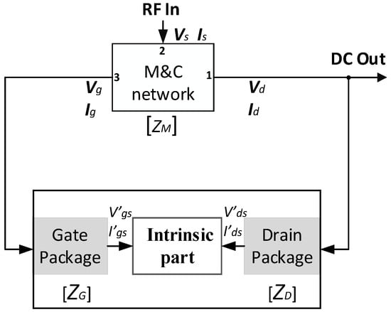 A brief diagram of the self-driving transistor rectifier including the device model and passive network is shown in Figure 5. The three-port passive network is used as matching, and gate-coupling circuits are used to match impendence, meanwhile coupled power from RF is input to the drive itself, and the device model has divided intrinsic parameters and package parameters: ZG and ZD are represented Z-parameters of gate package and drain package, respectively.