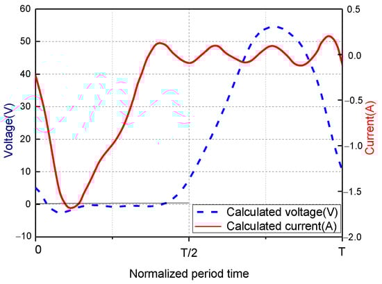 Based on the time-reversal duality, the inverse class F waveform of a classical PA was selected as target waveform to achieve high-efficiency rectifier design. The internal voltage V’gs and V’ds are designed to shape the target waveform according to the steps discussed in the previous section, and the input power and load of the rectifier were 10 W and 50 Ω, respectively. After optimization, the final values of V’gs and V’ds are listed in Table 5. The calculated rectification waveform in a normalized period is shown in Figure 6. It can be found that the generated rectification waveforms are very close to the ideal target voltage and current waveforms of inverse class F, i.e., the voltage is half-sine, and the current is square.
