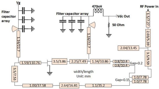 The circuit topology and dimensions of the self-synchronous RF–DC rectifier.