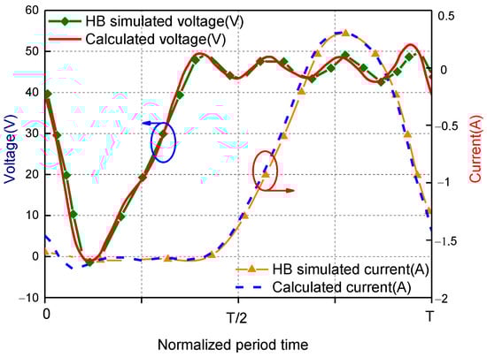 The current and voltage waveforms shown in Figure 6 are calculated from the internal drain and gate voltages. Now, the rectifier is implemented as the circuit topology shown in Figure 7, and harmonic balance (HB) simulation was carried out in ADS. The results of comparing the waveforms achieved by HB simulation with the targets are shown in Figure 8. Very small waveform distance indicates that the proposed method is feasible.