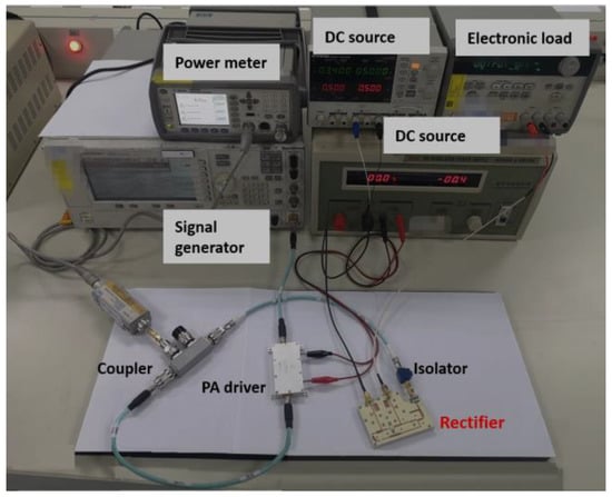 The test setup of the rectifier is shown in Figure 9. The three ports of the rectifier are the RF power input, the gate negative voltage bias, and the DC output port, respectively. A 5.8 GHz microwave signal generated by the signal generator and amplified by the drive amplifier is fed into the RF input port of the rectifier through a coupler and an isolator. The coupling port of the coupler is connected to the power meter to measure the RF power fed into the rectifier, and the DC source provides −3.4 V bias for the gate. The DC output port is connected to the electronic load, which supplies 50 Ω load resistances, and the output voltage was read directly.