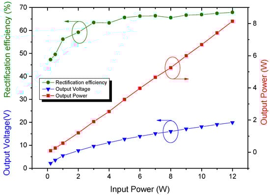 The measured results of the rectification efficiency, output power, and output voltage are shown in Figure 10.