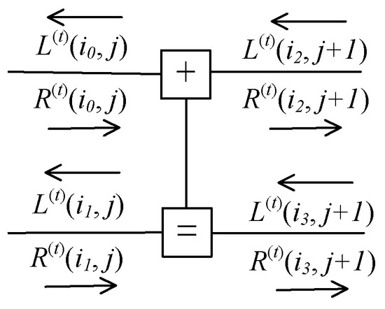 For the BP decoding algorithm, each node in the factor graph contains two types of messages: right-to-left messages and left-to-right messages , where t represents the iteration number. According to the coding structure of polar codes, the log-likelihood ratios (LLR) messages of nodes on both sides in the factor graph are respectively initialized as [15]