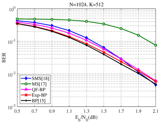 Figure 3, Figure 4, Figure 5 and Figure 6 show the BER performance of different algorithms with different code lengths. Firstly, the BER performance of the proposed Exp-BP algorithm is analyzed in detail. As shown in Figure 3, when the code length is 1024 and ≤ 1.3 dB, the BER performance of the proposed Exp-BP algorithm basically coincides with that of the BP algorithm. However, with the increasing of the SNR, i.e., , the BER performance of the proposed Exp-BP algorithm is inferior to that of the BP algorithm.