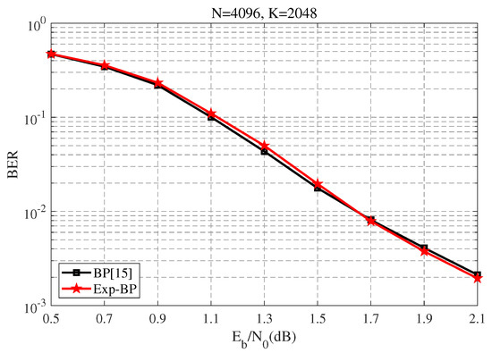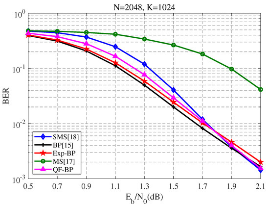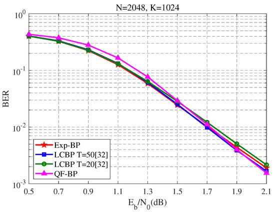 As shown in Figure 6, the BER performance of the proposed Exp-BP algorithm is slightly better than that of the LCBP algorithm with . Similarly, when ≤ 1.7 dB, the BER performance of the proposed Exp-BP algorithm is similar to that of the LCBP algorithm with , but is slightly lower than that of the LCBP algorithm with in the high SNR region. In addition, compared with the LCBP algorithm with , the proposed QF-BP algorithm has similar BER performance in the high SNR region.