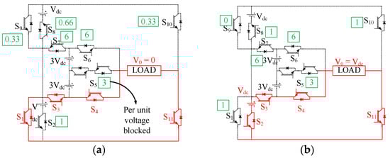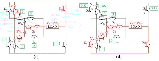 The schematic structure of the topology is illustrated in Figure 1. The components used comprise 10 unidirectional switches (bidirectional current flow and unidirectional blocking of voltage) and 1 bidirectional switch (consisting of two switches in common emitter configuration) with two pairs of dc voltage sources each of Vdc and 3 Vdc. Healthy topology operation produces 15 levels 0 to ± 7 Vdc of output load voltage. Diodes D1, D2, D3, D4, D5, and D6 are present to tackle the flyback effect at the instant of fault occurrence. The switching states with all the redundancies are displayed in Table 1.