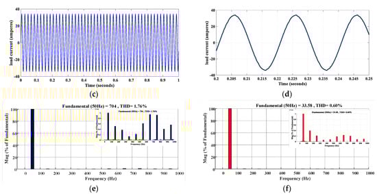 Simulation results of the proposed structure during healthy operation comprising (a) load voltage, (b) magnified view of load voltage, (c) load current, (d) magnified view of load current, (e) voltage harmonic characteristics acquired from Fourier analysis, and (f) current harmonic characteristics.