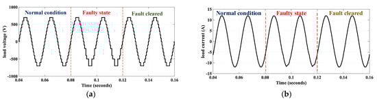 The performance of the proposed topology was verified in MATLAB-Simulink™ R2016b and PLECS™ version 4.0.8 environment using Intel® Core™ i5-3210M 2.50 GHz simulation. The associated parameters are listed in Table 3. The modulation scheme executed was nearest level control (NLC) PWM for load voltage control. The NLC causes switching transitions at a low switching frequency, thus minimizing the switching losses and enhancing the inverter reliability. Model parameters are listed in Table 3. The results under healthy operation and faulty conditions are presented.