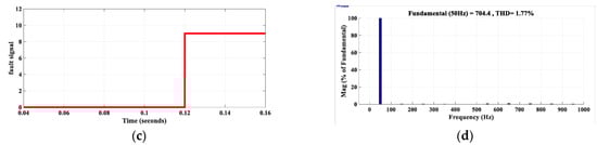 Simulation results for S9 fault for (a) load voltage, (b) load current, (c) fault detection signal, and (d) voltage harmonics profile.