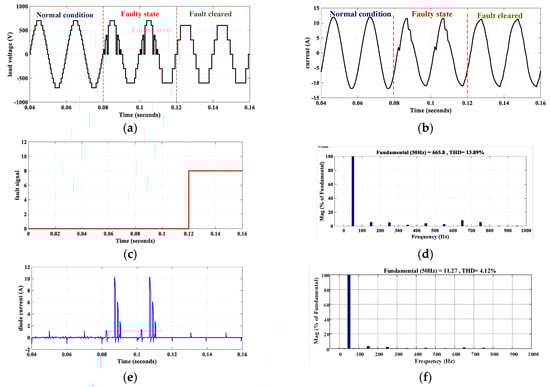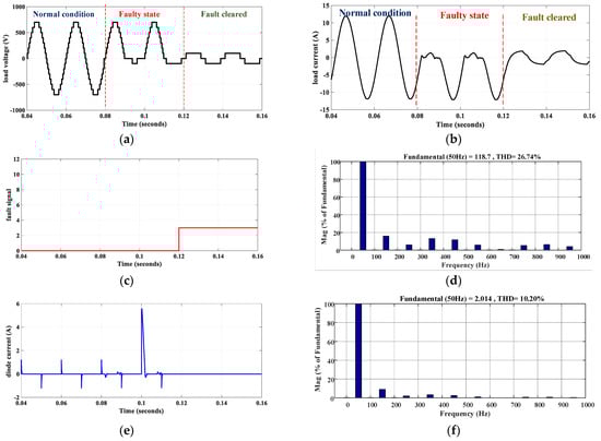 Simulation results for S8 fault for (a) load voltage, (b) load current, (c) fault detection signal, (d) voltage harmonics profile, (e) diode current, and (f) current harmonics profile.