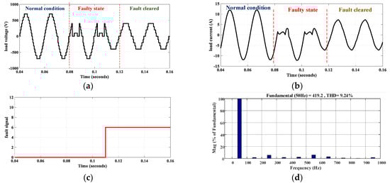 Simulation results for S6 fault for (a) load voltage, (b) load current, (c) fault detection signal, and (d) voltage harmonics profile.