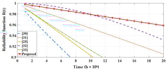 The fault in S1/S9 is represented by the second term. The equation’s third term reflects fault in S2/S8. The fourth term of the above equation reflects fault in S3/S7. Similarly, sixth seventh, and eighth terms represent a fault in S4/S6, S5, and S10/S11 respectively. The reliability curve and its comparison with previous topologies are depicted in Figure 13 for 20 years. It is recognizable that the proposed topology has higher reliability than topologies introduced in [15,16,20,24,25,29].