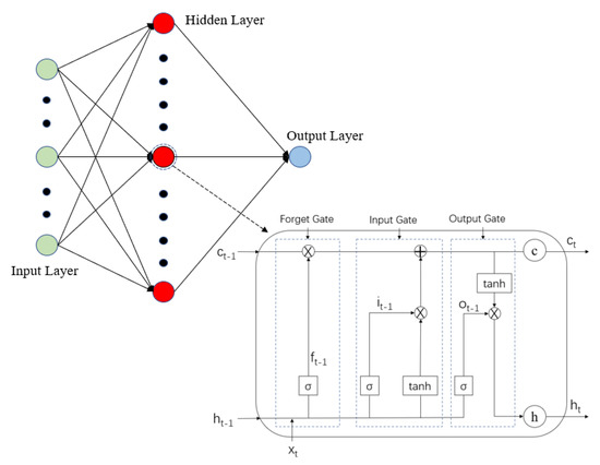 where represents time; represents the input data; denotes the forget gate; denotes the input gate; denotes the output gate; denotes the final output data; represents the weight of the forget gate; represents the weight of the output gate; represents the input of the forget gate; represents the temporary weight; represents the bias value corresponding to forget gate; represents the bias value corresponding to input gate; represents bias value corresponding to output gate; represents temporary bias; represents the unit state; represents the unit temporary state; represents the product of matrices; represents a activation function; represents a activation function, and represents two vectors are joined together [38].