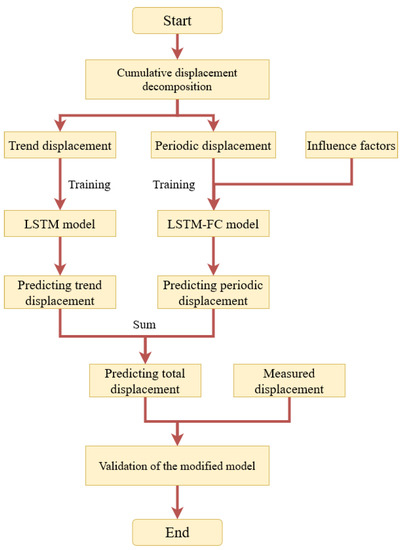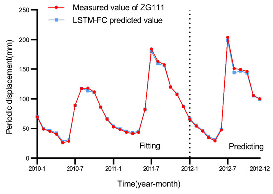- Because the periodic displacement in landslide displacement is easily affected by external environmental factors, it cannot be accurately predicted. Therefore, this study combined an LSTM model and a fully connected layer to construct an LSTM-FC model that allows the new model to receive previous and future information during training to predict the periodic displacement. The final total predicted displacement is the sum of the trend term and periodic term.