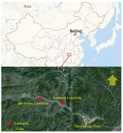 In this research, the practical performance of the modified model for landslide displacement prediction is verified by using the Baishuihe and Bazimen landslides. The specific geographical locations of two landslides are shown in Figure 4.