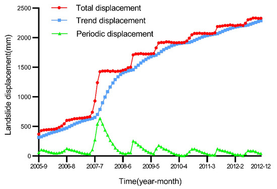 The cumulative displacement of the Baishuihe landslide is decomposed by the WMA method, and then the actual displacement trend and the detached periodic displacement can be worked out. The curves of cumulative displacement, displacement trend and periodic displacement are shown in Figure 7.
