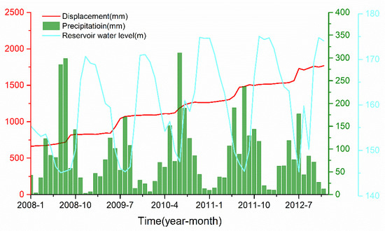This study uses 60 groups of data of Bazimen landslide. Each group contains landslide displacement, rainfall and reservoir level data. The data begin in January 2008 and end in December 2012, and its collection frequency is once a month. This data set can be acquired for academic research by the National Cryosphere Desert Data Center/National Service Center for Speciality Environmental Observation Stations. The data are collected once a month and shown in Figure 9. The capacity and availability of the modified model we designed can be verified by modeling and simulating these data.