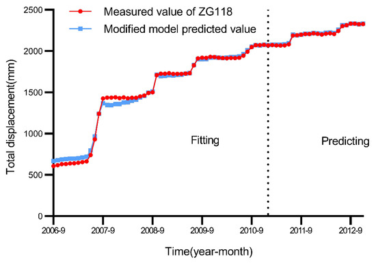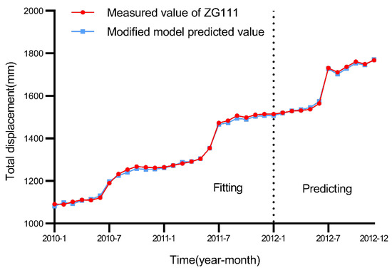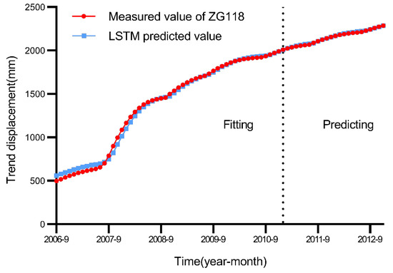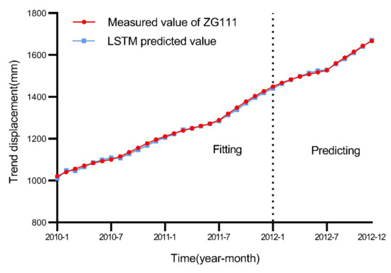 Because the displacement trend represents the intrinsic displacement change inside a landslide, it is less affected by external influences. In addition, the displacement trend of a landslide can represent the current state of the landslide, so this study uses the displacement trend of the first 12 months of a landslide to indirectly represent the state of landslide as the input variable to the LSTM model to predict the trend term of displacement and the predicted trend displacement as the output sequence. In this paper, the displacement trend data of the Baishuihe landslide in the first 76 months and of the Bazimen landslide in the first 48 months are used as the training data of the model to predict the trend displacements of Baishuihe landslide after 24 months and of Bazimen landslide after 12 months. The comparison between the prediction and actual results is shown in Figure 11 and Figure 12. It is obvious the modified model can precisely fit and predict the trend displacement of both landslides.