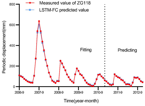 It can be seen from Figure 6 and Figure 9 that the cumulative displacement of the Baishuihe and Bazimen landslides began to increase rapidly in the first few months of the rainy season and when the reservoir water level decreased. After the rainy season and when the reservoir water level was stable, the change in landslide displacement basically ended. It can be concluded that the changes in rainfall and reservoir water level have a profound influence on the changes in the displacement of the Baishuihe and Bazimen landslides and are the inducing factors of the changes in the displacement of the two landslides. Therefore, the rainfall and reservoir water level are used as input variables to the LSTM-FC model to predict periodic landslide displacement, and the predicted periodic displacement is the output sequence. The periodic displacement data of Baishuihe landslide in the first 76 months and of Bazimen landslide in the first 48 months are used as the training data of the model to predict the periodic displacements of the Baishuihe landslide after 24 months and of the Bazimen landslide after 12 months. The comparison between the prediction and actual results is shown in Figure 13 and Figure 14. The modified model we proposed can precisely predict the periodic displacement of both landslides.