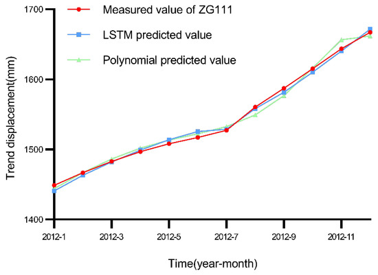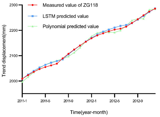 After several experiments and simulations, the construction of the LSTM model is set as follows. Considering that each year is a prediction cycle, the time step is set to 12, the learning rate is set to 0.01, and the amount of hidden layer nodes is set to 50. In this paper, the polynomial parameters in [29,30,31,32] are adopted, and the power of the polynomial is set to 3. Figure 17 and Figure 18 show that the prediction results of the LSTM model discussed in this paper are closer to the actual displacement trend. Table 1 reports the predictive performance of the two algorithms.