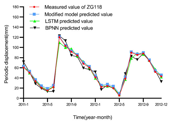 Periodic displacement predicted results of ZG118 using LSTM-FC, LSTM and BPNN models.