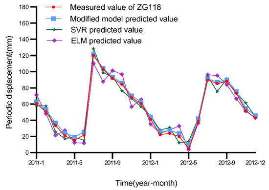 Periodic displacement predicted results of ZG118 using LSTM-FC, SVR and ELM models.