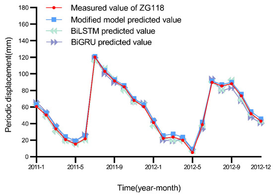 Periodic displacement predicted results of ZG118 using LSTM-FC, BiLSTM and BiGRU models.
