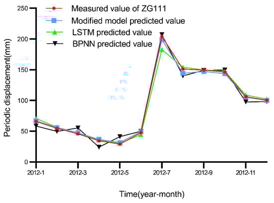 Periodic displacement predicted results of ZG111 using LSTM-FC, LSTM and BPNN models.