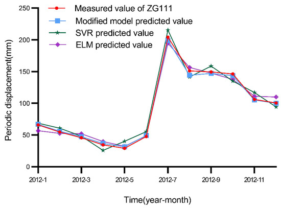 Periodic displacement predicted results of ZG111 using LSTM-FC, SVR and ELM models.