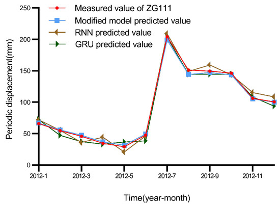 Periodic displacement predicted results of ZG111 using LSTM-FC, RNN and GRU models.