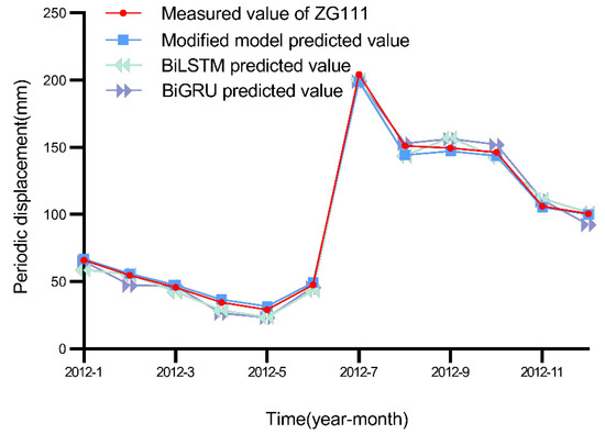 Periodic displacement predicted results of ZG111 using LSTM-FC, BiLSTM and BiGRU models.