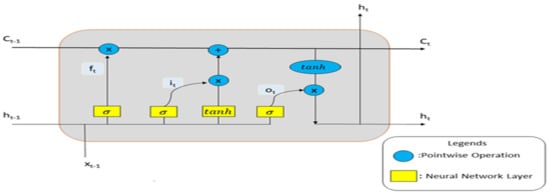 Component-wise multiplication is denoted by *. To add information to the cell, the input gate adds it, the forget gate removes it, and the output gate chooses information from the cell to be utilized as input in the prior step. The first forget gate acquires information at epoch t as a function of the input xt and the previous hidden layer ht−1. If the forget gate’s value is close to one, the last memory cell ct−1 will be retained. Otherwise, the data are deleted. Second, the new information is combined with the old concealed state to generate the input gate . It is turned into a memory cell to create a new . Finally, the output gate determines which information will be utilized to create the next concealed state. More information on the algorithm’s architecture may be found in [41].