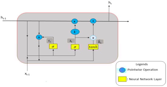 GRU is also presented as a solution for the vanishing gradient issue, similarly to how LSTM works. Sherstinsky [42] presented an extension to the LSTM. The system’s recurrent units can handle long-term dependencies across a broad range of periods. In the GRU algorithm, the input and forgotten gates of the LSTM are coupled with a single update gate, which serves as both the input and forgotten gates. Furthermore, the cell states and the hidden states are combined in the method developed by [43]. The representation of a GRU cell can be seen in Figure 2.