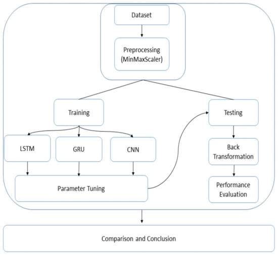 The aim of this study is to forecast short-term to mid-term electrical usage utilizing deep learning algorithms such as LSTM, GRU, and CNN. These algorithms were selected for this investigation because they have been utilized effectively in various time-series studies. Moreover, the proposed models can handle entire data sequences as well as single data points. Although there are many powerful RNN algorithms, in this study, we employed LSTM because the LSTM cell increases long-term memory capacity in an even more efficient manner since it allows learning even more parameters. Moreover, it has the capacity of handling a large amount of non-linear data [47]. This makes it the most effective method of forecasting, particularly when there is a longer-term trend in the data set. We trained LSTM and others algorithms in the same way that we would estimate a time series model of Box–Jenkins. Algorithms, as a time series model, use the lags of the time series data that we are analyzing. The suggested methodology exclusively employs data derived solely from time-series itself. As a result, it is effective, straightforward, and forceful. The univariate structure of the methodology leads it to be utilized globally as well as locally