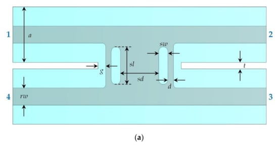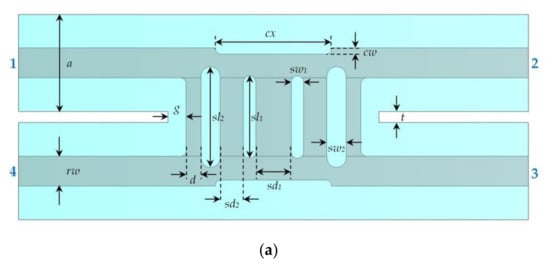 - Fahmi, M.M.; Ruiz-Cruz, J.A.; Mansour, R.R. Contra-directional ridge waveguide couplers: Design and applications. IEEE Trans. Microw. Theory Tech. 2019, 67, 4966–4975. [Google Scholar] [CrossRef]