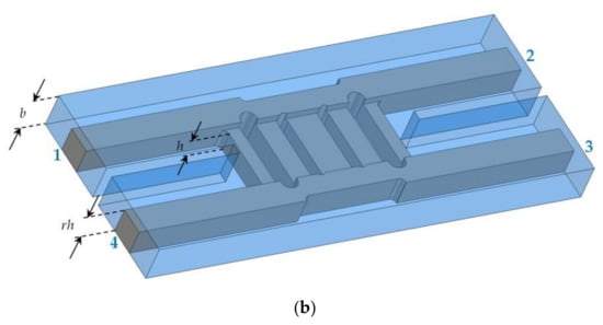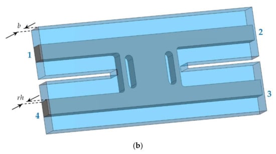 The adopted ridge waveguide cross-section is 13 mm × 5.5 mm with ridge height and width equal to 4 mm, leading to a cutoff frequency fc = 6.36 GHz. The quadrature hybrid coupler geometry is shown in Figure 1, where indices 1, 2, 3 and 4 indicate the input port, the direct port, the coupled port and the isolated port, respectively. The air inside a metallic background and the metallic ridge are illustrated for better clarity.