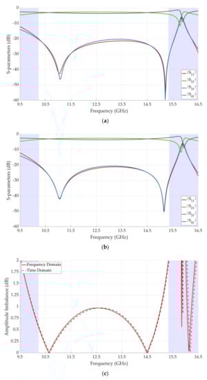The simulated scattering parameters, amplitude imbalance and phase difference curves between the direct port and the coupled port are reported in Figure 2.