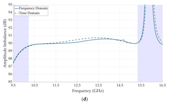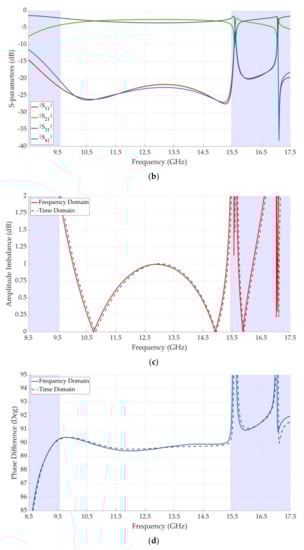 The device bandwidth ranges from 10.23 GHz to 15.33 GHz, corresponding to a fractional bandwidth of 39.91%. A phase difference in the range of ±1 degree around 90 degrees can be observed in this frequency band. The time-domain performance exhibits very good agreement with the frequency-domain results. The frequency intervals outside the device bandwidth are shaded for better clarity.