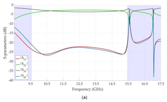 where a1 = 1.701, b1 = 1.072 and λg is the guided wavelength. All geometrical parameters, which are listed in Table 1, are the result of a full-wave optimization using a CST Microwave Studio built-in genetic algorithm in the frequency domain. The design targets are specified according to input port matching, with isolation higher than 20 dB and a maximum amplitude imbalance of 1 dB. This last feature represents the transmission coefficients’ magnitude difference between ports 2 and 3, and the value of 1 dB is adopted for an accurate power division at the output ports. Nevertheless, for a subsequent comparison with the state of the art, the device bandwidth is defined as the frequency interval where input port matching and isolation are better than 20 dB, and a maximum amplitude imbalance of 2 dB is tolerated. It is worth mentioning that the frequency domain solver in CST Microwave Studio relies on an adaptive meshing function; that is, a tetrahedral mesh is automatically generated and refined with an appropriate number of tetrahedrons for the electromagnetic structure under analysis. In order to confirm the achieved performance and validate the frequency-domain results, the coupler is also simulated in the time domain using a fine hexahedral mesh with 16 cells per wavelength and cell refinement around the edges.