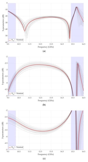 The proposed couplers are closed structures in hollow metallic waveguides with no dielectric; thus, a CNC milling machine manufacturing process is well suited for their fabrication. Most modern CNC standards have tolerances in the range of ±0.05 mm. In order to highlight the design robustness and reliability, a tolerance analysis on the most critical HC1 geometrical parameters was carried out. In particular, the slot length sl, the slot width sw, the slot separation sd, the slot distance from edge d and the gap g were swept in a range of ±0.10 mm from the nominal values of Table 1, for a total of 32 simulations. Tolerance analysis results are reported in Figure 5, and show little deviation from nominal values in the bandwidth even with an increased tolerance range with respect to state-of-the-art processes.