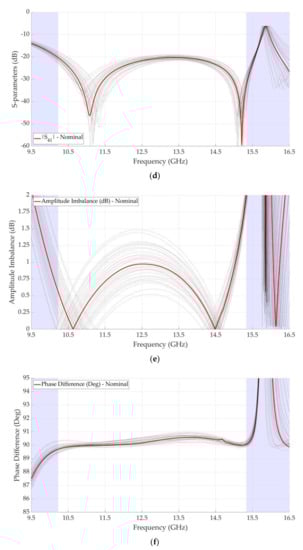 Hybrid coupler 1 (HC1) tolerance analysis simulations. (a) |S11|. (b) |S21|. (c) |S31|. (d) |S41|. (e) Amplitude imbalance. (f) Phase difference.