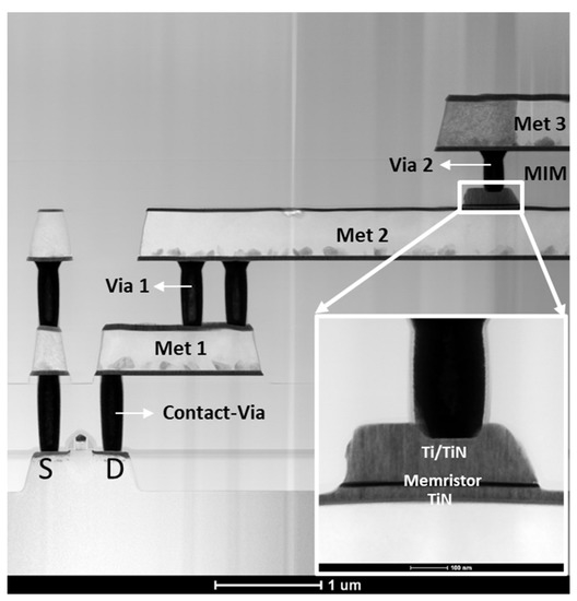 TEM cross-section of an integrated 1T–1R memristor device, fabricated in 130 nm CMOS technology. The inset micrograph illustrates the memristor module.