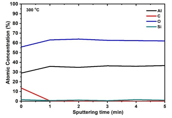 The presence of thin Al2O3 layers was verified by using TEM and EDX analyses as shown in Figure 2. However, the stoichiometry of them was not determined using the EDX technique due to the limitation of their depth resolution. Further, the Al2O3 films were deposited using an industry standard TALD process with negligible nucleation delay with respect to their growth cycles [41]. The films were grown layer by layer using a self-terminated surface reaction process; they are reported widely in the literature to be stoichiometric [42,43]. Additionally, the Al2O3 layers grown on silicon substrates were analyzed using X-ray photoelectron spectroscopy (XPS) depth profile analysis for their stoichiometry as shown in Figure 3. The ratio of O/Al atomic concentrations was determined to be ~1.5, indicating the Al2O3 layers as being stoichiometric.