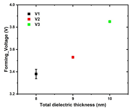 The mean values of the forming voltages with their dispersions versus the total dielectric thickness of V1, V2 and V3 memristive devices are as shown in Figure 4. Furthermore, the corresponding I–V characteristics of the forming operations are illustrated in Figure 5. The forming voltages increase with the addition of the Al2O3 layers in the V2 and V3 devices. According to the literature, the forming voltage of the memristive devices is directly proportional to the thickness of the dielectric and inversely proportional to the square root of the dielectric constant [46,47]. The effective thicknesses of the memristive layers in V1, V2 and V3 devices are 8, 9 and 10 nm, respectively. Additionally, the measured dielectric constants of Al2O3 and HfO2 are ~8.5 and ~22, respectively. The increase in the effective dielectric thickness with the addition of Al2O3 layers, which also has lower dielectric constant, plays a major role in the increase in the forming voltages observed in Figure 4.