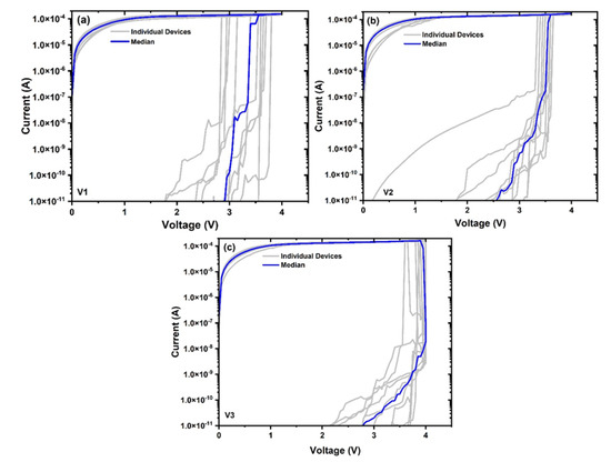 Forming I–V characteristics of (a) V1, (b) V2 and (c) V3 device variants. The characteristics of individual devices from each variant are represented in grey, and the computed median curves are represented in blue.